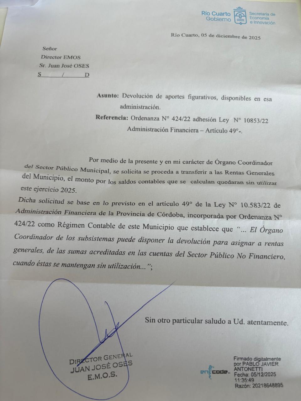 Lo máximo que aceptó Osés fue transferir provisoriamente 330 millones de pesos de superávit que tuvo el Emos para que pasara a Rentas Generales del Municipio. Hasta ahí llegó. Pero desde el Palacio le pedían que todo el manejo de la caja pasara a Economía, es decir, a Antonetti.