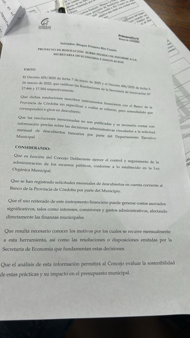 «En dos resoluciones se suscriben instrumentos financieros con el Banco de la Provincia de Córdoba sin especificar a cuáles se refieren, pero entendiendo que corresponden a giros en descubierto. Las resoluciones no son publicadas y es necesario contar con información precisa sobre las decisiones administrativas vinculadas a la solicitud mensual de descubiertos bancarios por parte del Departamento Ejecutivo Municipal», se lee en el proyecto de la oposición.